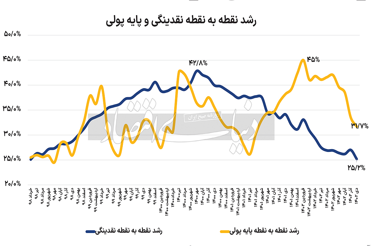 آمارهای اعلامی بانک مرکزی نشان میدهد رشد نقطهبهنقطه نقدینگی در دیماه با کاهش ۱.۸واحد درصدی نسبت به ماه قبل ۲۵.۲درصد است. رشد نقطهبهنقطه پایه پولی نیز با کاهش ۱.۸واحد درصدی نسبت به ماه قبل به ۳۱.۷درصد رسید.