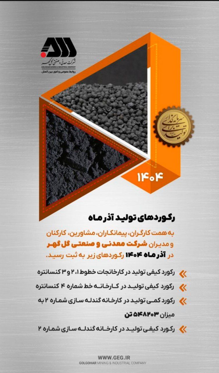 کارخانجات شرکت معدنی و صنعتی گل‌گهر در آذرماه ۱۴۰۴ با ثبت رکوردهای تازه تولید، گام مهمی در مسیر افزایش بهره‌وری، پایداری تولید و تحقق برنامه‌های توسعه‌ای این شرکت برداشتند.