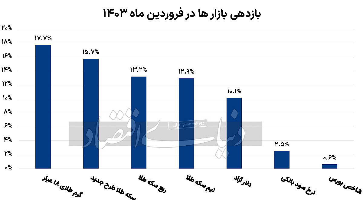 در نتیجه این امر قیمت قطعات مختلف فلز طلا در بازار تهران نیز در هفتههای اخیر رشد چشمگیری را تجربه کرد. نمودار بازدهی بازارها در ماه نخست بهار ۱۴۰۳ نشان میدهد که هر گرم طلای ۱۸ عیار که در بازار روز ۲۸ اسفند ماه سال گذشته در رقم ۳ میلیون و ۲۵۳ هزار تومان معامله میشد با رشدی ۱۷.۷ درصدی به رقم ۳ میلیون و ۸۲۹ هزار تومان در بازار روز گذشته رسید.
