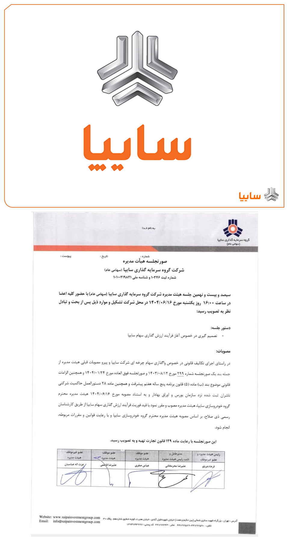 به گزارش اقتصادنامه، در سیصد و بیست و نهمین جلسه هیاتمدیره گروه سرمایهگذاری سایپا (سهامی عام) که روز یکشنبه ۱۶ شهریور ماه برگزار شد، اعضای هیاتمدیره پس از بحث و بررسی، تصمیم به آغاز فرآیند ارزشگذاری سهام سایپا توسط کارشناسان رسمی ذیصلاح گرفتند.