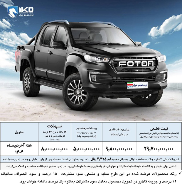 به گزارش اقتصادنامه، ایرانخودرو دیزل طرح فروش نقدی پیکاپ فوتون اتوماتیک همراه با تسهیلات ویژه و پرداخت مرحلهای را برای متقاضیان در نظر گرفته است. زمان تحویل این محصول هفته آخر دی ماه ۱۴۰۴ است.