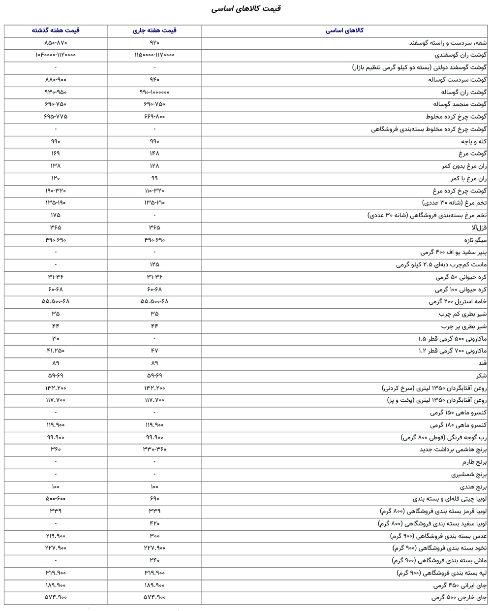در ادامه قیمت برخی از کالاهای اساسی آمده است؛ قیمتهای زیر یک میلیون تومان به هزار تومان و برای وزنهای نوشته نشده یک کیلوگرم است.
