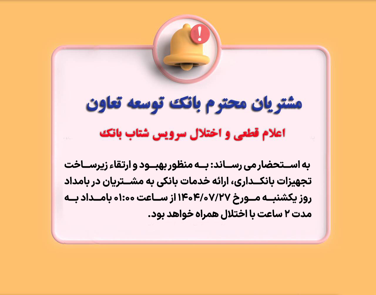 به گزارش اقتصادنامه به نقل از روابط عمومی بانک توسعه تعاون، به منظور بهبود و ارتقاء زیرساخت تجهیزات بانکداری، ارائه خدمات بانکی به مشتریان در بامداد روز یکشنبه مورخ ۱۴۰۴/۰۷/۲۷ از ساعت ۰۱:۰۰ بامداد به مدت ۲ ساعت با اختلال همراه خواهد بود.