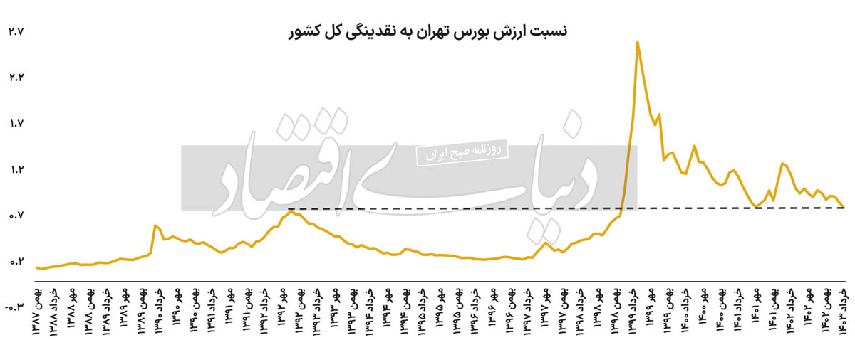 نسبت ارزش بورس تهران به نقدینگی کل کشور، به ۰.۸ رسیده که از مهرماه دو سالقبل بیسابقه است. مهر ماهی که منجر به رونق بورس تهران از آبان۱۴۰۱ تا اردیبهشت۱۴۰۲ شد، پس از آنکه ارزش بورس در تیر۹۹ به ۲.۶ رسید، فقط در فروردین۱۴۰۲ به ۱.۲۸در مرحله حساس فعلی رسید. اگر بورس میزبان خوبی نباشد، احتمالا بخش بزرگی از این نقدینگی به دلار و سکه و طلا تبدیل میشود که منجر به تورمهای بالا خواهد شد، اما تنوع ابزارها در بازار سرمایه سبب شدهاست این نقدینگی نه صرفا در بازار سهام، بلکه در صندوقهای طلا و درآمد ثابت خواهد ماند.