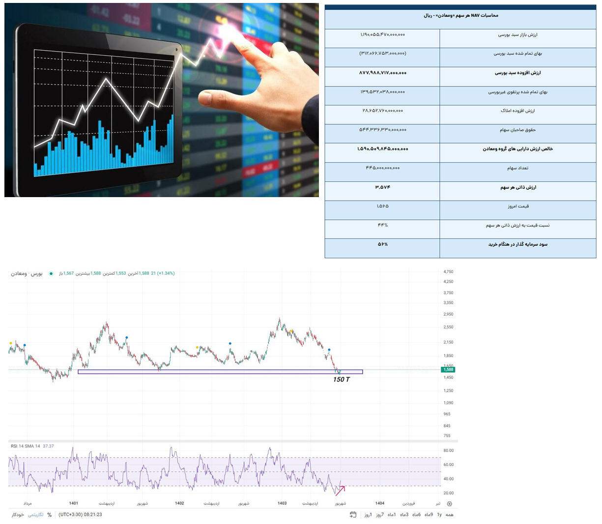 در عمل هر سهم «ومعادن» ۳۵۷ تومان می ارزد! در ضمن این محاسبات با فرض اعمال بهای تمام شده پرتفوی غیربورسی شرکت محاسبه شده است! چه بسا اگر به رقم ارزش روز پرتفوی غیربورسی دسترسی داشتیم، مسلما ارزش ذاتی هر سهم «ومعادن» بالاتر از رقم های فعلی می بود.