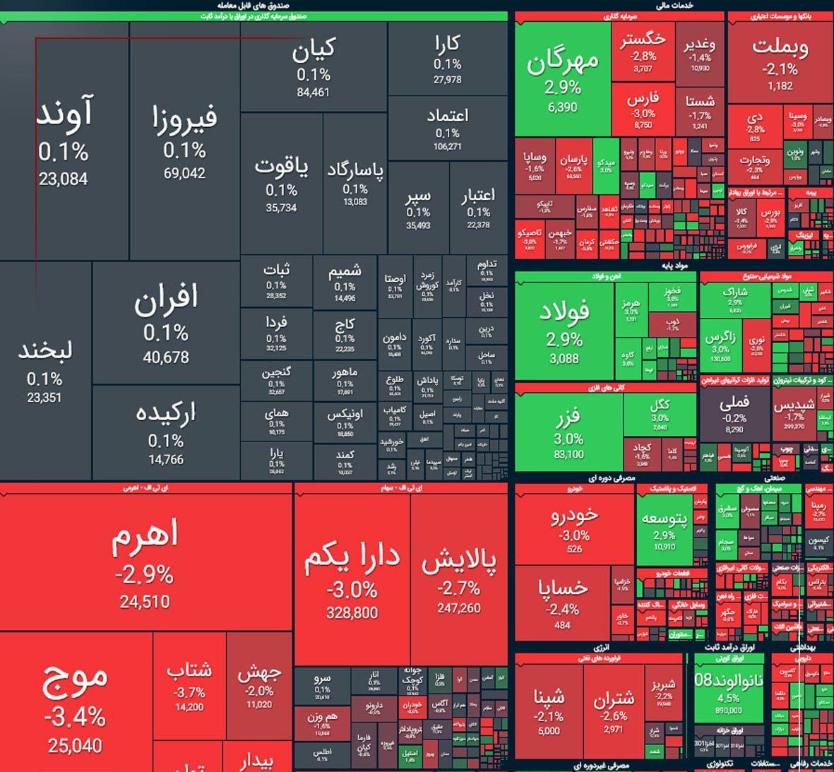 در میان نمادهای بزرگ، «فولاد»، «فملی»، «میدکو»، «فارس» و «نوری» بیشترین اثر منفی را بر شاخص کل داشتند. در مقابل، «خودرو» و «خساپا» از معدود نمادهایی بودند که اندکی اثر مثبت بر نماگر بازار گذاشتند.