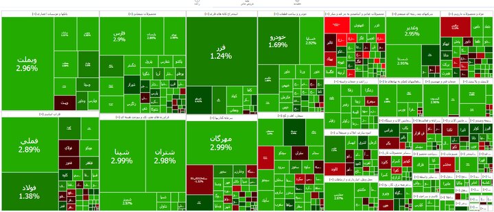 نمادهای پرتراکنش امروز «مهرگان، وبملت، خودرو، خساپا، فولاد، شپنا و فملی» بودند و نمادهای «فملی، فارس، شپنا، وبملت، وغدیر، شتران و شستا» بیشترین تاثیر را بر شاخص کل بر جای گذاشتند.